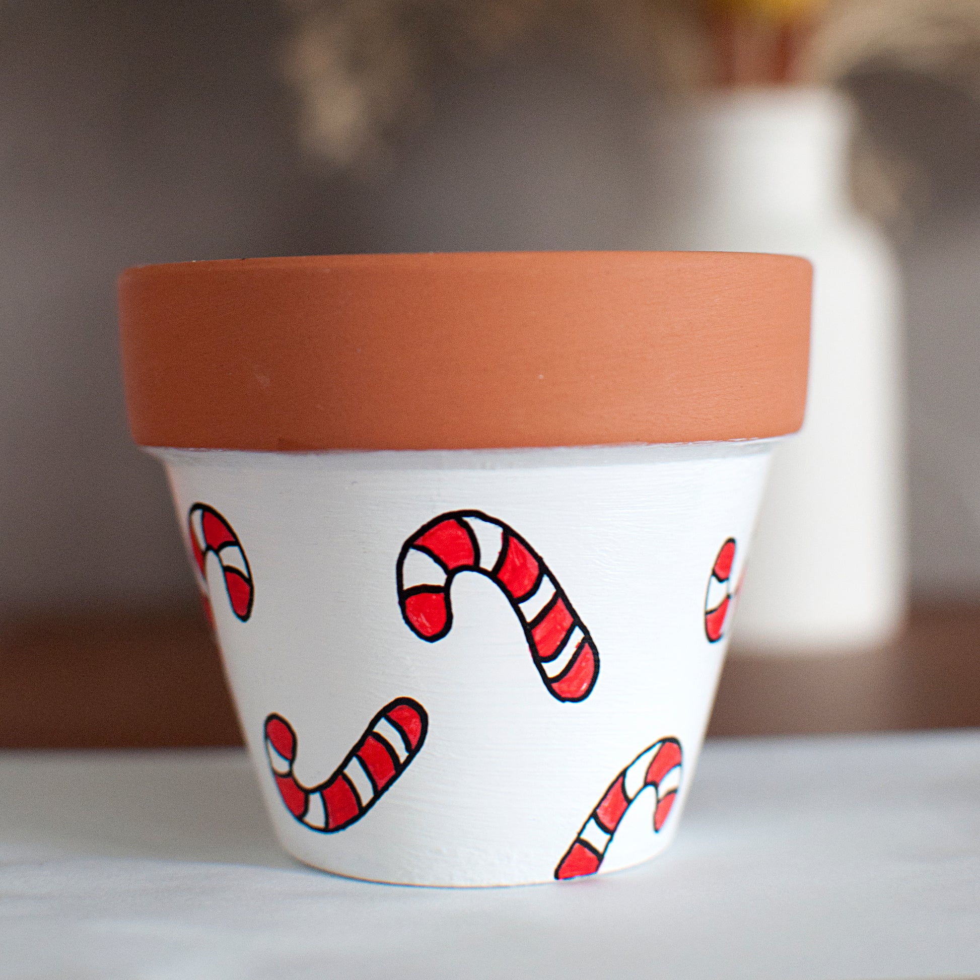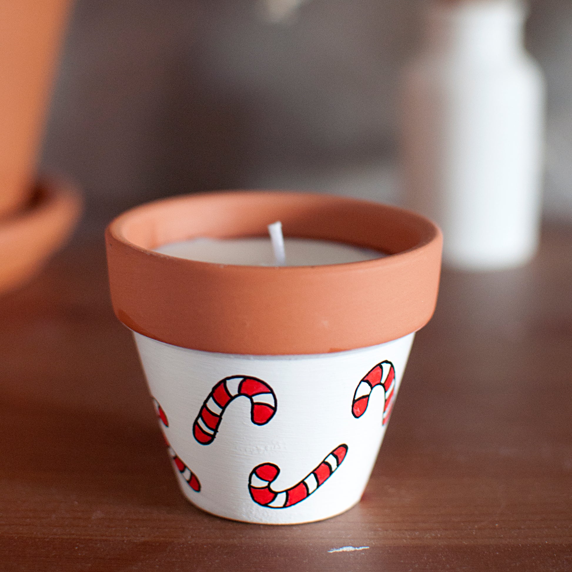 Bougie dans un contenant en terre cuite à l'odeur gourmande de sucre d'orge.